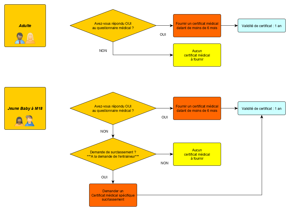Ce surclassement ne concerne que les jeunes évoluant en compétition, de BABY à M18. Il leur permet de jouer dans la catégorie supérieure. Ce certificat n’est valable qu’1 an et il est à renouveler à chaque saison. Seul le modèle proposé par la fédération est valable : Certificat médical obligatoire.